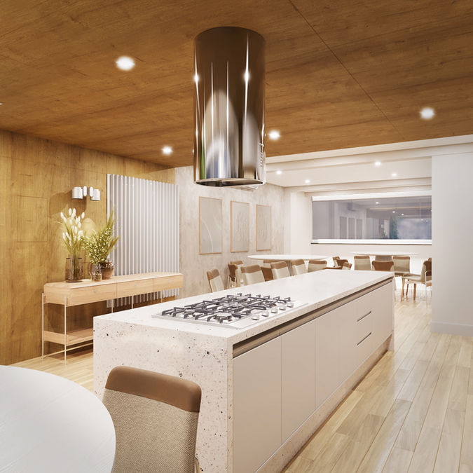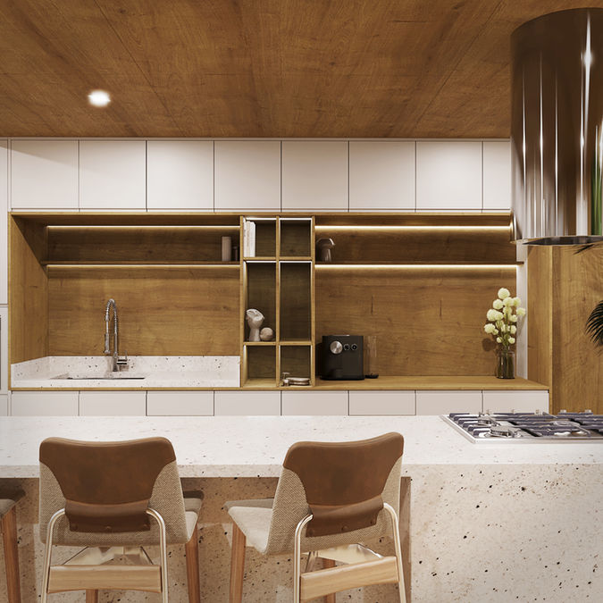 Clássica união de madeira com pedra clara e vegetação criam um refugio para pequenos eventos em um condomínio em Santos